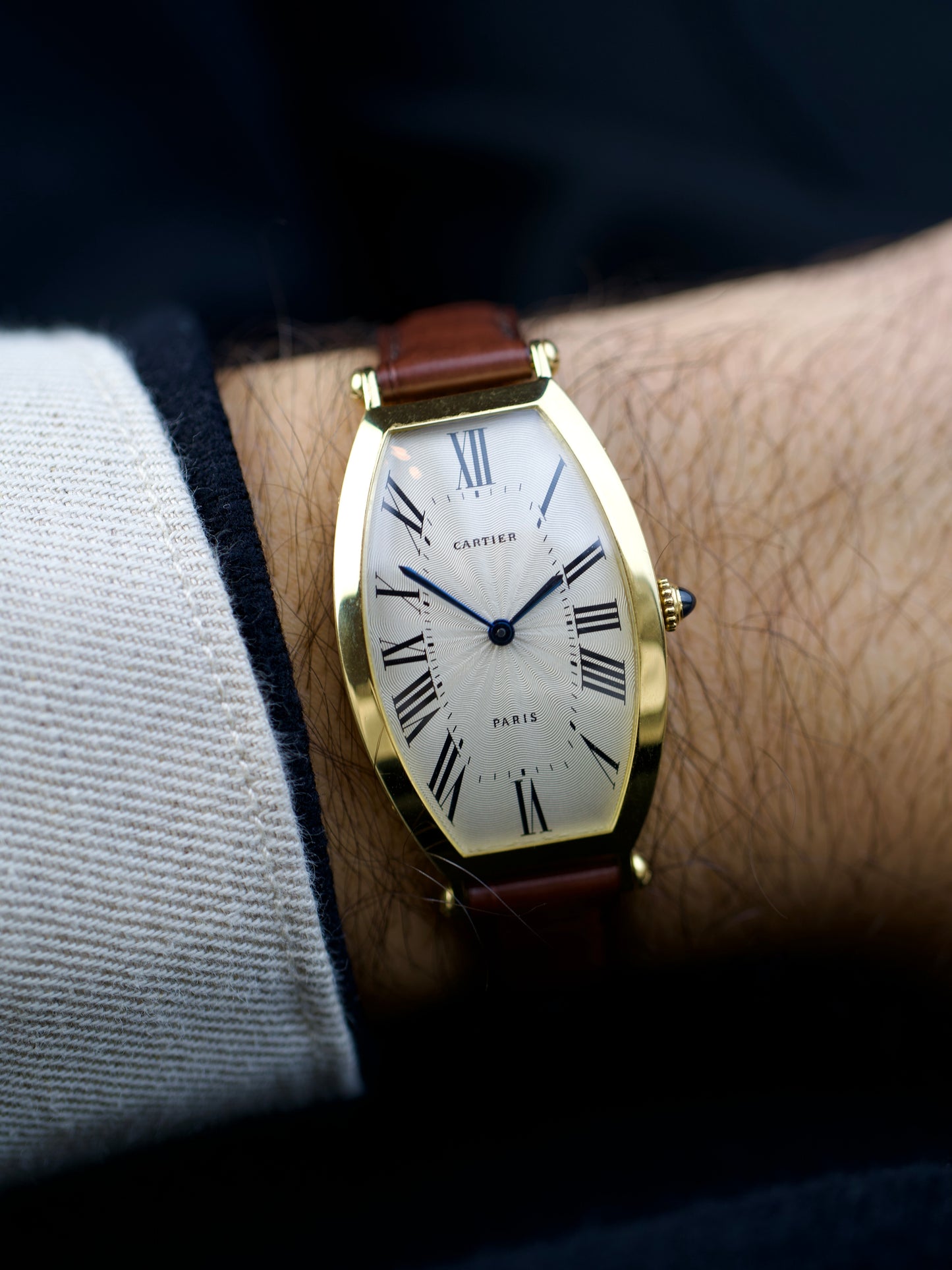 It features an 18k gold case measuring 26 x 46 mm, a modern and sensible size. The mechanical hand-wound movement is powered by F.Piguet. Overall, this Cartier Tonneau is in excellent condition. The case is unpolished and has its original edges and curves.