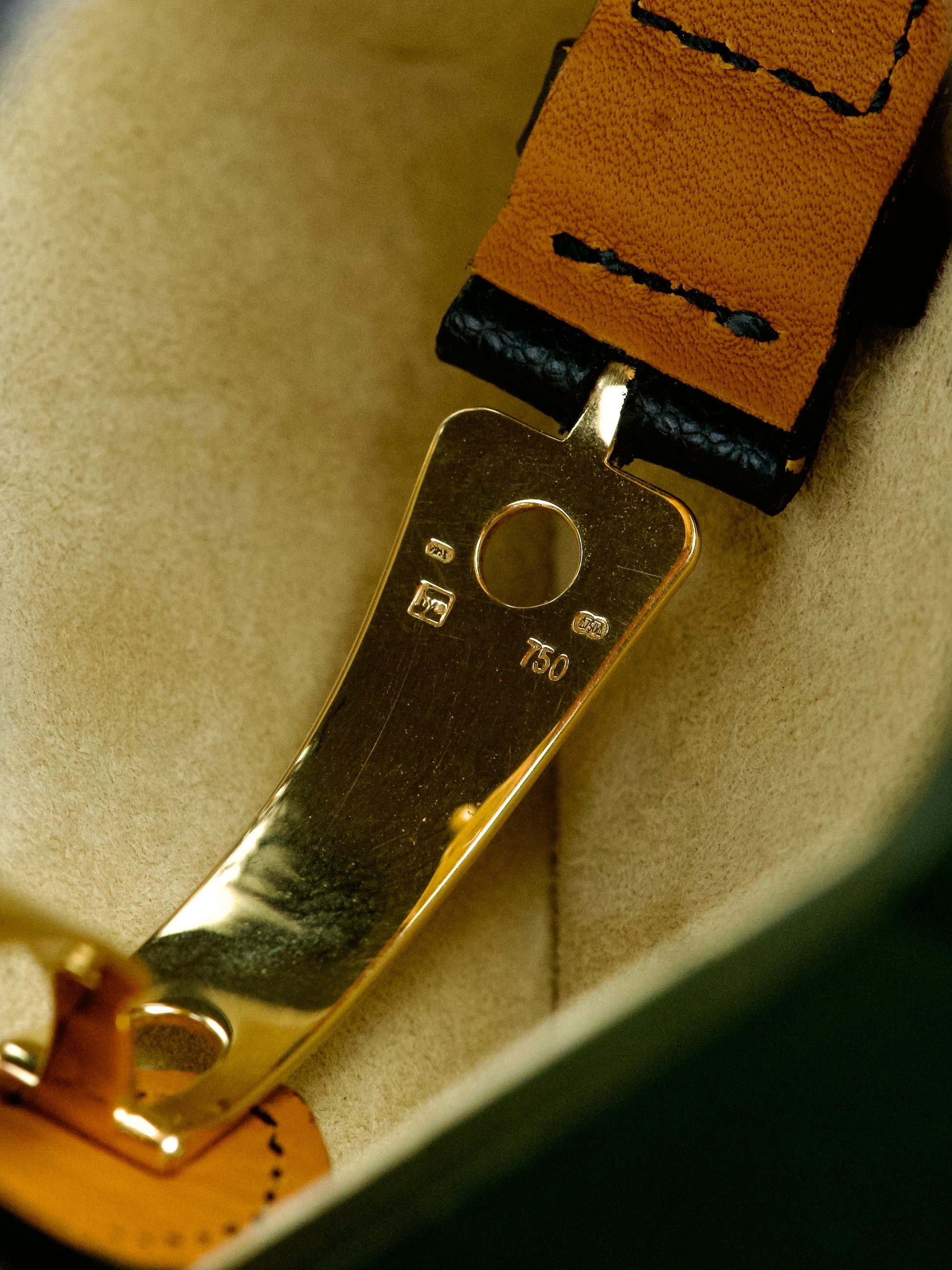 The strap wears super comfy and is made out of Leather! The Audemars Piguet folding clasp of this luxury preowned timepiece is made of 18 carat yellow gold. The watch is in unpolished condition. On the back the serial number is clear visible and the hallmarks are all crisp.